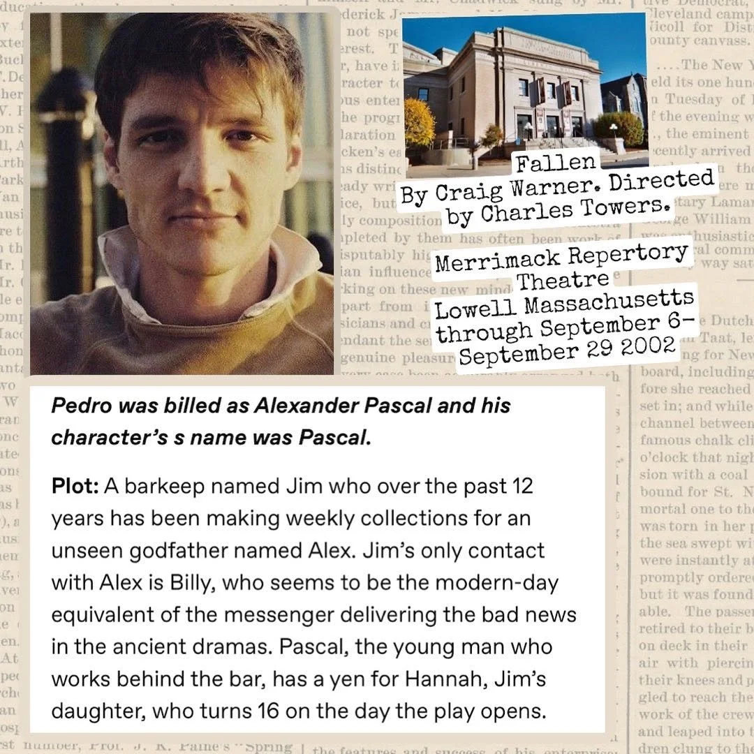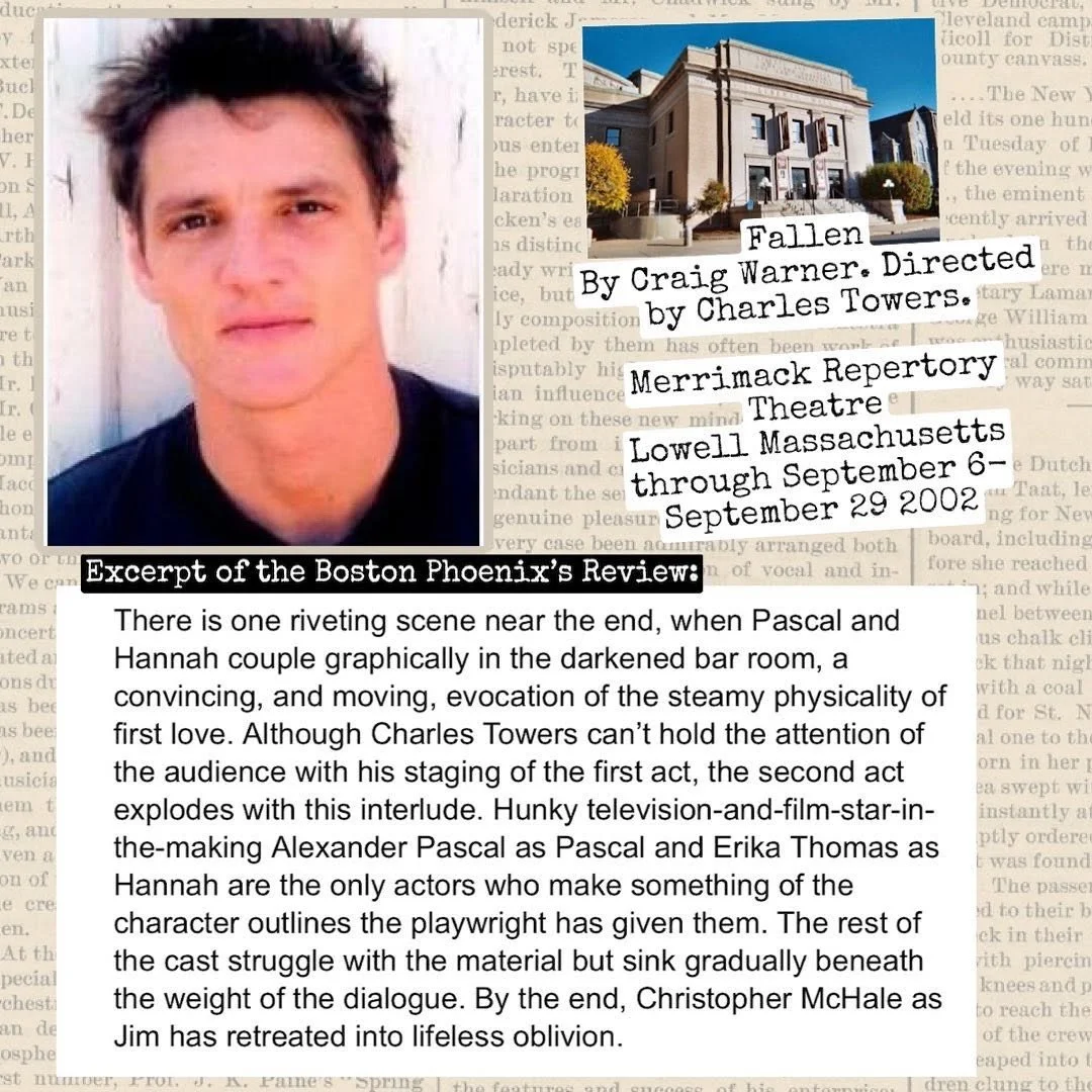 Craig Warner’s Fallen was staged as a world premiere at Merrimack Repertory Theatre in September 2002. The play followed Jim, a mob collector whose past mistake caused the death of a crime boss’s son. On his daughter’s 16th birthday, the boss demanded vengeance, forcing Jim to face the same kind of loss. While reviews noted issues with the script, Pedro, appearing under Alexander Pascal was praised as giving “the most appealing performance” in his role as a young bar employee. Read the review