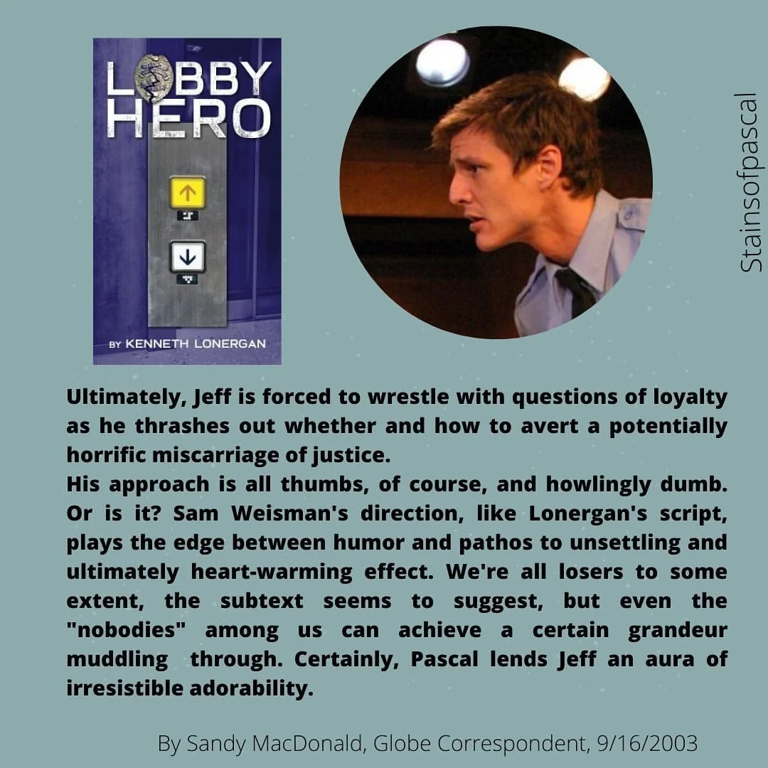 In the summer and early fall of 2003, Pedro Pascal—then billed as Alexander Pascal—appeared as Jeff in Lobby Hero, a sharply observed comedy-drama by Kenneth Lonergan, the Academy Award-winning writer and director of Manchester By The Sea. Directed by Sam Weisman, the production was staged at Wellfleet Harbor Actors Theater in Cape Cod, Massachusetts.
